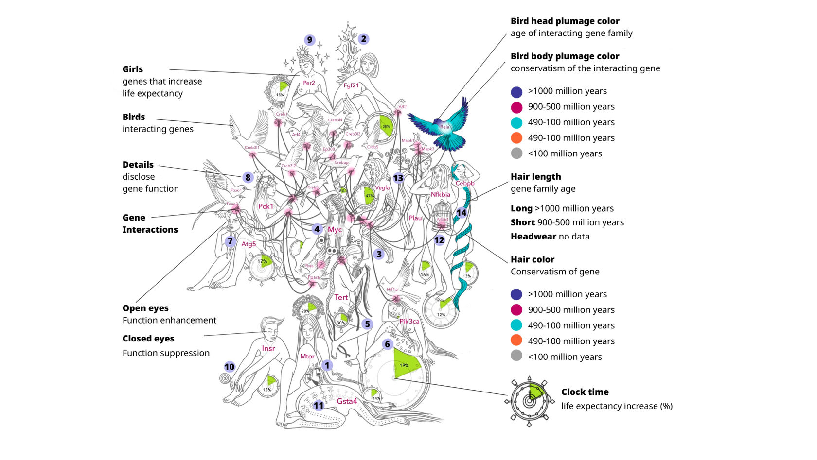 The Per2 gene, which plays a key role in regulating circadian rhythms, must be suppressed to prolong life. This gene does not have any data on the origin of the gene family or conservatism, so the girl with closed eyes is depicted in a headdress, hiding the length and color of her hair. The headdress is decorated with images of the sun and moon, to represent the gene's role in the regulation of circadian rhythms.